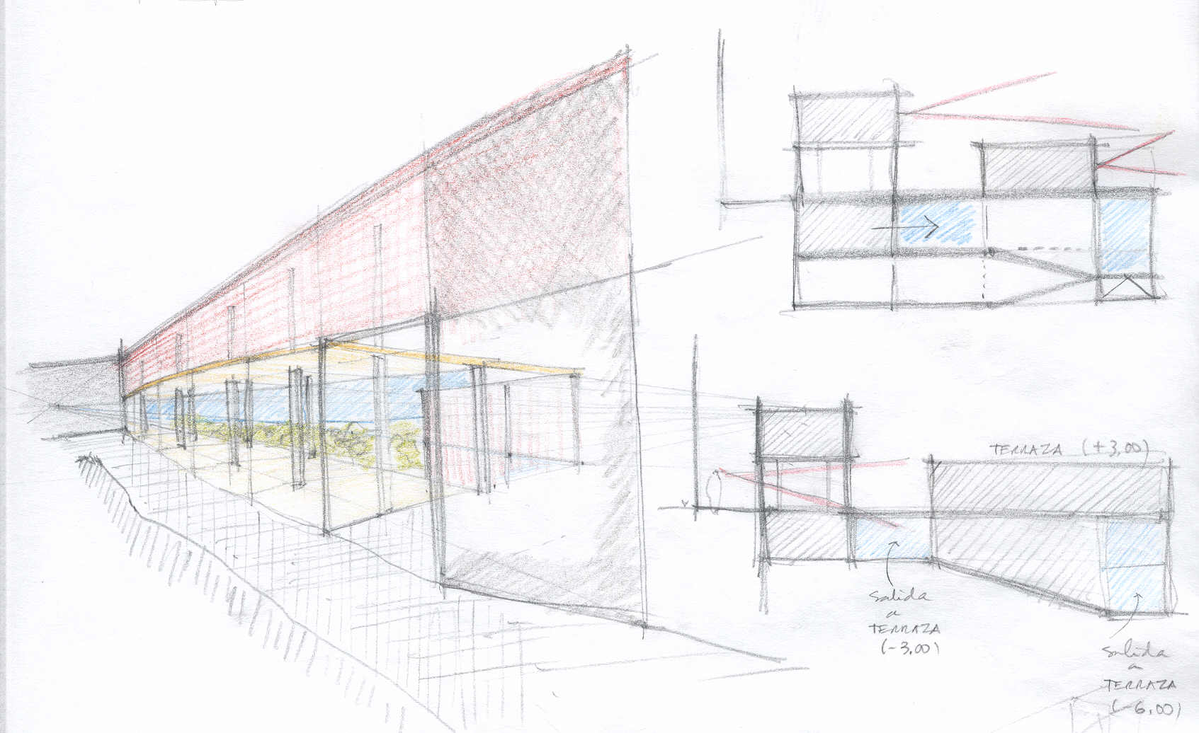 Un edificio de dos plantas, que realmente tiene cuatro; se mimetiza en el medio empleando los recursos que la historia y el Patrimonio arquitectónico local le proporcionan: terrazas a distintos niveles.
