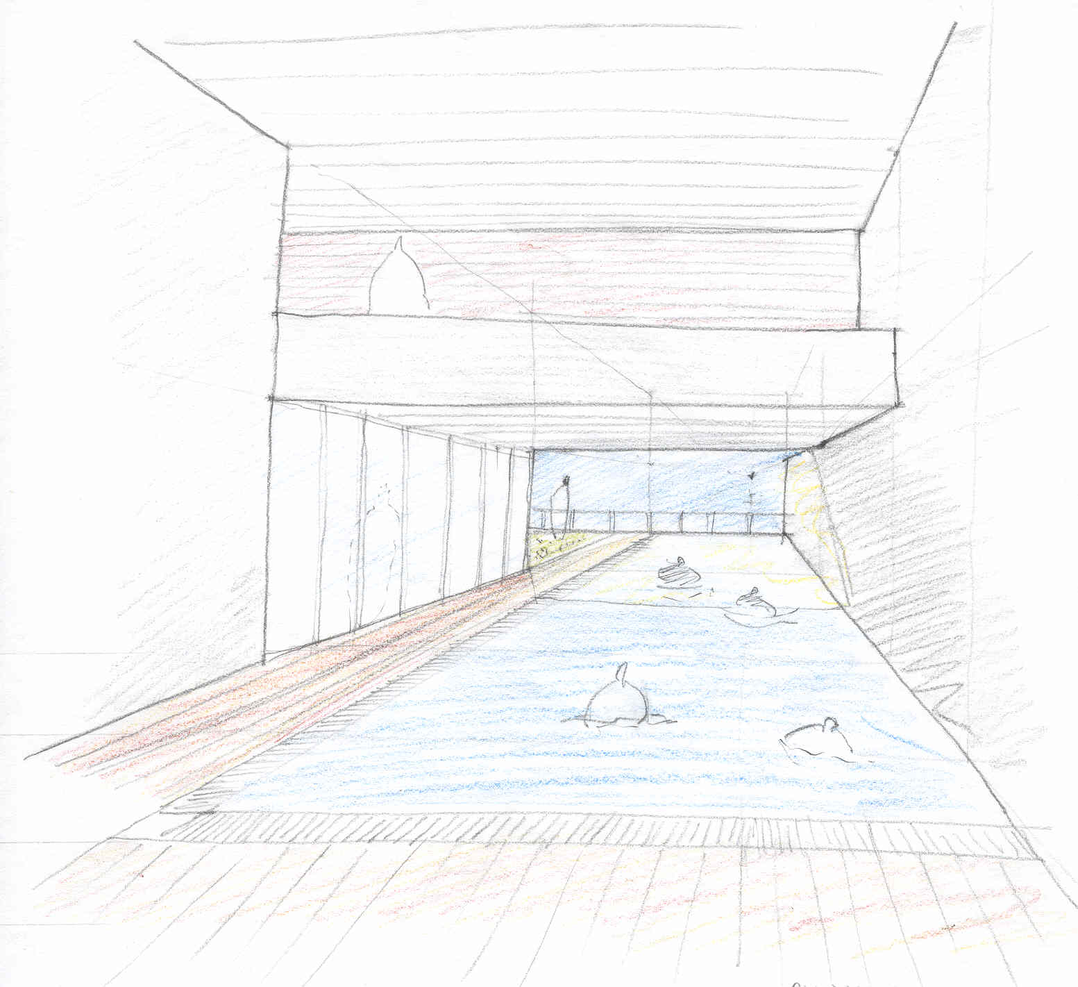 La piscina del albergue sufrió distintas ubicaciones a lo largo del proceso proyectual; desde la opción mas inmediata, que consistía en colocarla en una de las terrazas como si de la cubierta de un trasatlántico, tanto el emplazamiento como el concepto mismo cambió. Finalmente se optó por recrear el ambiente que existió alli una vez, bóvedas, cuevas oscuras desde donde contemplar el exterior. Pese a estar cubierta en gran parte, la piscina se considera al aire libre por cuanto que no existe un tratamiento higrotérmico del aire. La lámina de agua introduce reflejos acuáticos en la doble altura que puede observarse desde la escalera. Una piscina que por levantarse donde antes hubo lóbregas bodegas acabó convirtiéndose en una cueva marina.