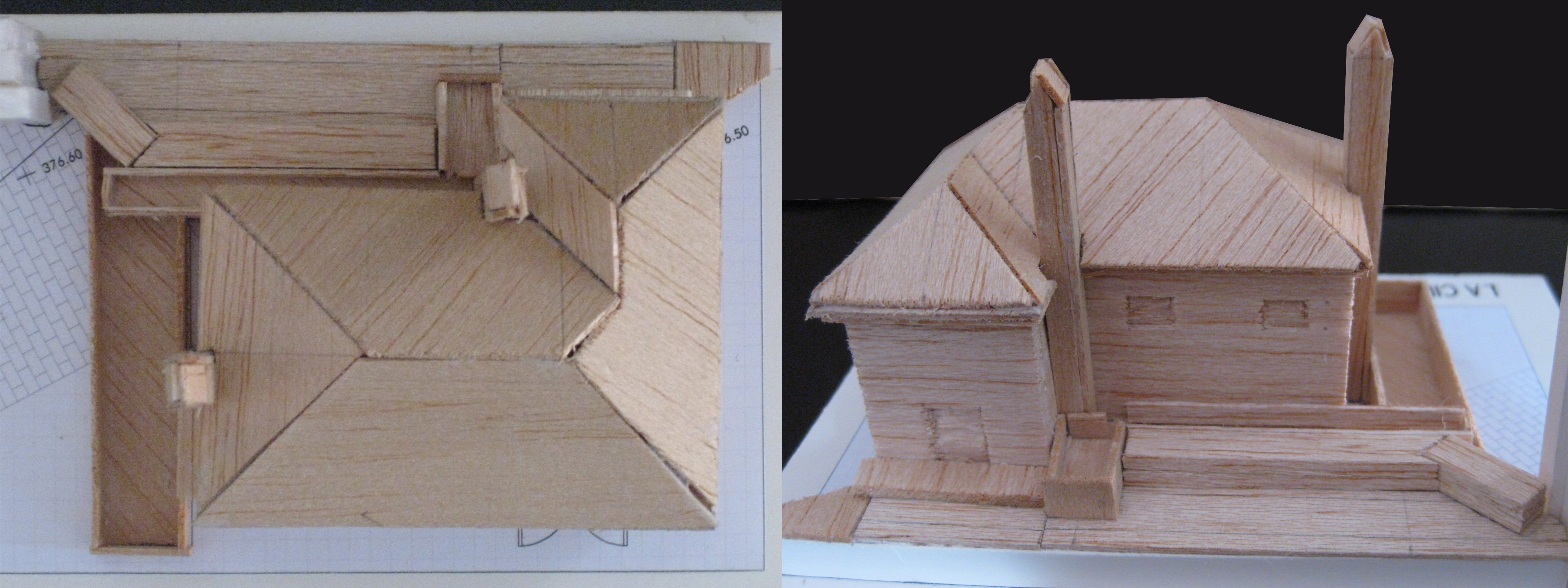Maqueta. Vista en planta del alcorque-banco del plátano centenario y vista desde el norte, a la izquierda la fachada lateral de la iglesia